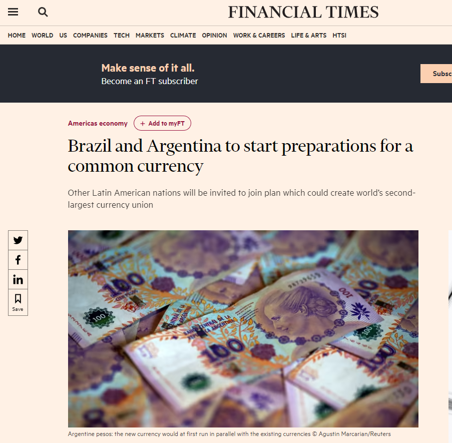 英国《金融时报》报道,今年1月,巴西与阿根廷宣布,两国将就创建属于拉美地区的共同货币进行准备工作,并将邀请拉美地区其他国家加入,以促进区域贸易、降低对美元的依赖。