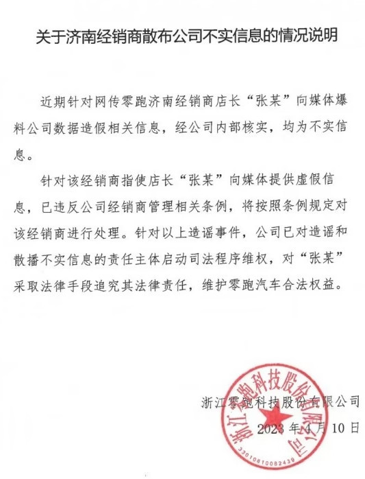 对此,零跑汽车于4月11日回应:张某爆料的公司数据造假相关信息,经公司内部核实,均为不实信息。