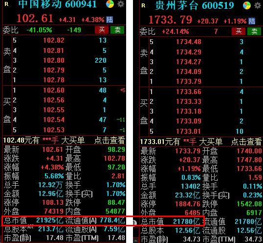 4月17日上午,中国移动(600941)最新市值超越贵州茅台(600519),成A股市值最大公司!