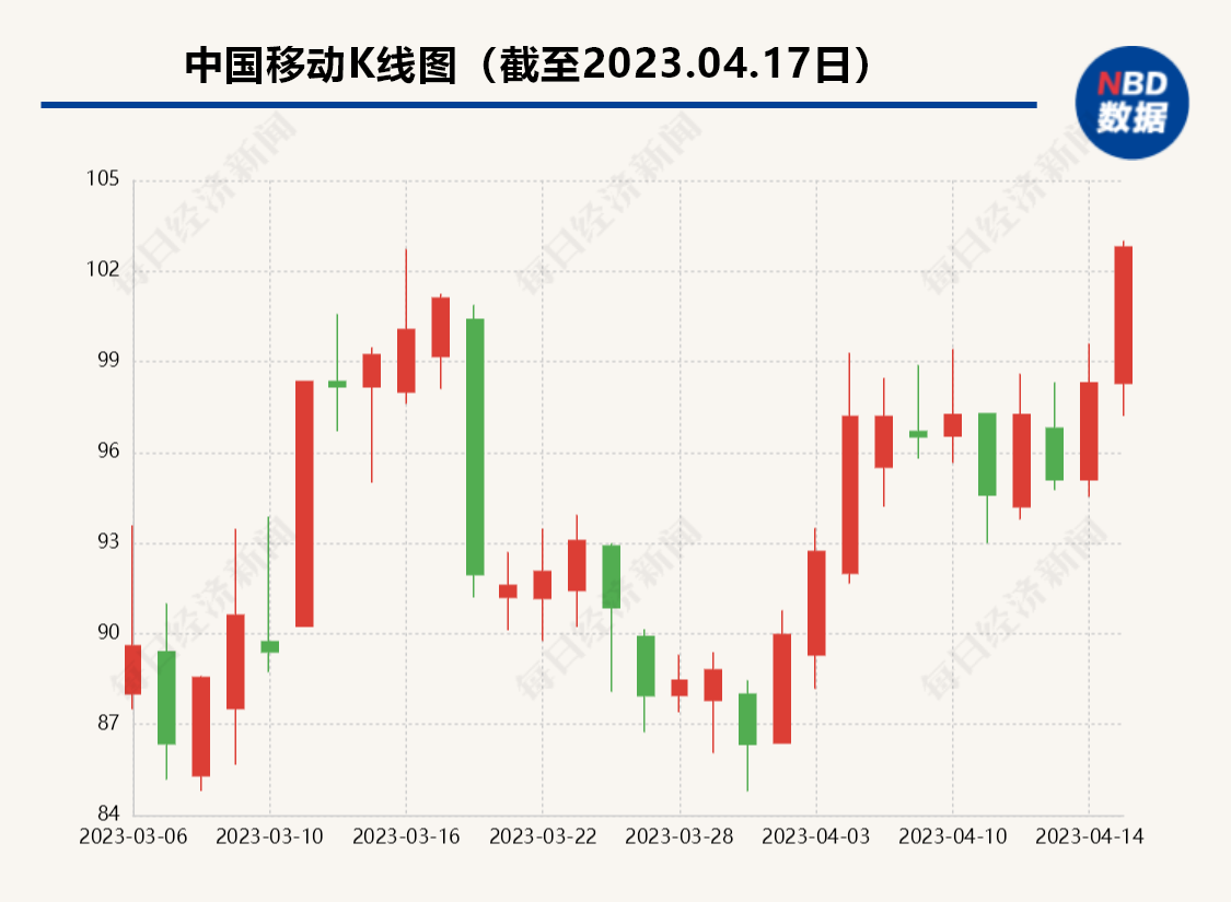 截至发稿,中国移动涨4.45%,报102.67元/股,总市值达21844亿元。