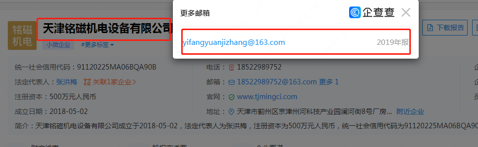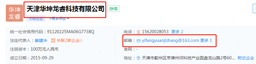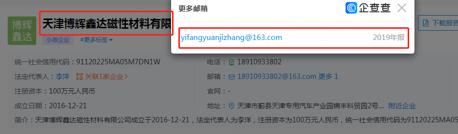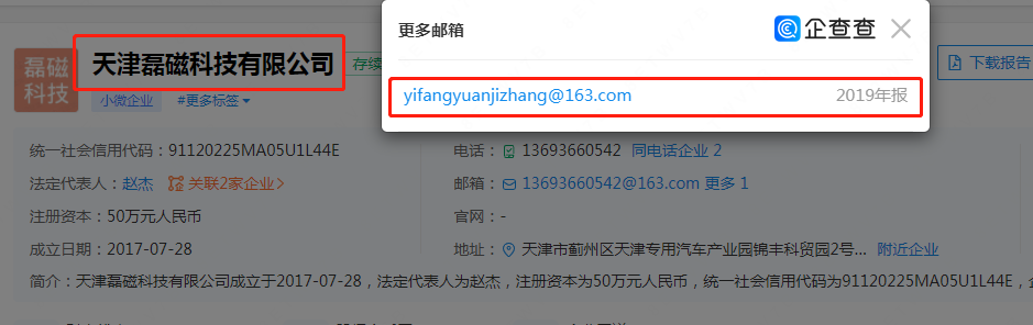 然而通过对比工商信息,《V财网》发现一件比较有趣的事,京磁股份披露的报告期内九家主要外协供应商中,过半的外协供应商曾使用同一联系邮箱。根据企查查显示,工商外协供应商天津铭磁机电设备有限公司、天津锐屹达科技有限公司、天津博辉鑫达磁性材料有限公司、天津华坤龙睿科技有限公司,四家外协供应商2019年年报联系邮箱均为yifangyuanjizhang@163.com。
