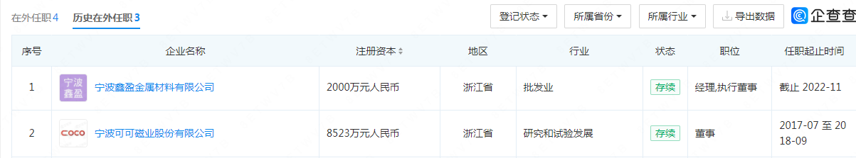 不仅如此,京磁股份还对主要供应商宁波鑫盈金属材料有限公司进行废料销售,是公司2019年三大废料销售客户,而公司披露的同期废料销售第一大客户宁波可可磁业股份有限公司。但是根据企查查显示,宁波鑫盈金属材料有限公司实控人刘普杰此时正是担任宁波可可磁业股份有限公司董事。即意味着两者实为关联方,而公司也未提及两公司之间的关联。
