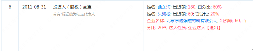 但是根据企查查显示,宁波雄海稀土速凝技术有限公司有两大自然人股东分别是朱海松以及曲东海,其中曲东海持股比例为22.7%,朱海松为公司法人直接持股比例29%,最终受益股份43.78%,从持股占比可见两人足够构成对宁波雄海稀土速凝技术有限公司的实际控制。朱海松、曲东海两人还曾同为宁波京磁磁业有限公司股东,宁波京磁磁业有限公司联营方之一就是京磁股份,而京磁股份却并未披露该项关联。