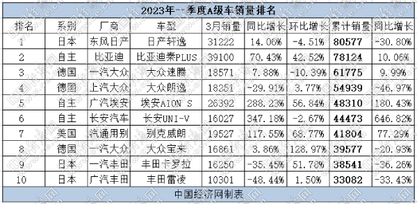 具体来看,3月,比亚迪秦PLUS如愿夺得A级车销量冠军,这也助推其一季度销量达7.8万辆,距离季度冠军仅相差2000余辆。业内人士表示,随着混动和纯电冠军版车型的相继推出,秦PLUS起步价进一步下探,这无疑提升了产品竞争力,也有望帮助其在全年销冠之争中取胜。