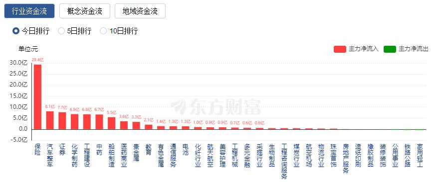 行业资金方面,截至收盘,保险、汽车整车、证券等净流入排名靠前,其中保险净流入29.35亿元。