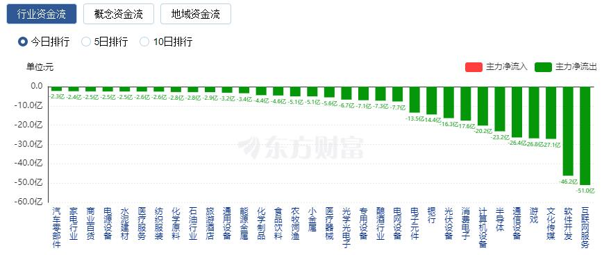 净流出方面,互联网服务、软件开发、文化传媒等净流出排名靠前,其中互联网服务净流出51.04亿元。