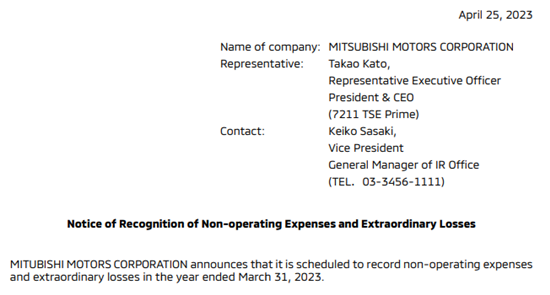 中国经济网北京4月28日讯(记者 张懿)三菱汽车4月25日宣布,预计在2022财年(截至2023年3月31日)的合并财务报表中计入121亿日元非营业费用(non-operating expense)和105亿日元特别损失(extraordinary loss)。另据日本国际广播电台(NHK WORLD)报道,由于中国对电动汽车需求日益增长,三菱在华已暂停生产燃油SUV车型欧蓝德。