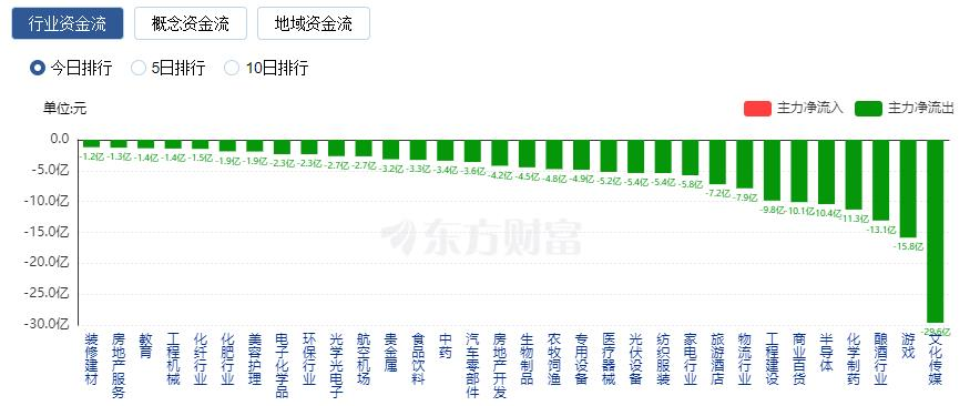 净流出方面,文化传媒、游戏、酿酒行业等净流出排名靠前,其中文化传媒净流出29.64亿元。