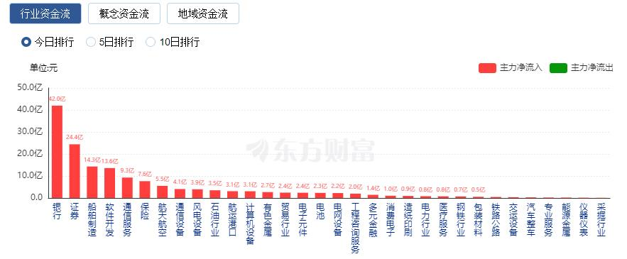 行业资金方面,截至收盘,银行、证券、船舶制造等净流入排名靠前,其中银行净流入41.97亿元。
