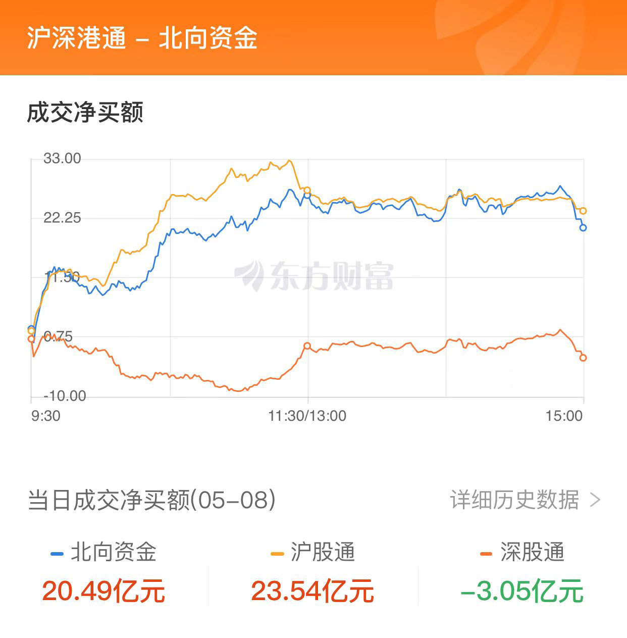 北向资金今日净流入,截至收盘,沪股通净流入23.54亿元,深股通净流出3.05亿元,合计净流入20.49亿元。