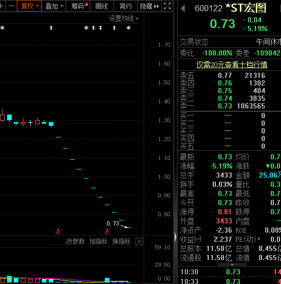 *ST宏图今日早盘再次跌停,跌停板封单超过百万手,最新股价报于0.73元/股,创下历史新低。自4月20日以来,该股已连续11个跌停板,是目前连续跌停次数最多的股票。