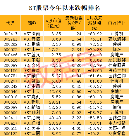39只ST股年内创历史新低