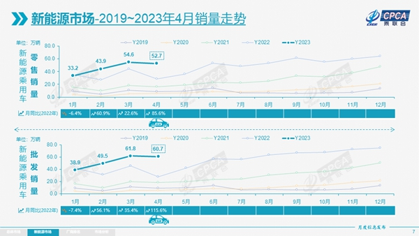 聚焦新能源板块,4月,新能源乘用车批发销量为60.7万辆,同比增长115.6%,环比下降1.7%。零售52.7万辆,同比增长85.6%,环比下降3.6%。