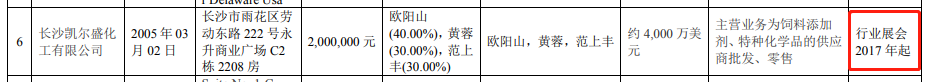 此外,埃索凯主要贸易商客户长沙凯尔盛化工有限公司控股股东范上丰还是钦州南海化工有限公司股东之一,有意思的是明明是老熟人而公司披露中却称公司是通过展会才开展的合作。问询回复显示,2019年、2020年、2022年公司对其销售金额分别为1,054.48万元、1,078.52万元、1,916.55万元。