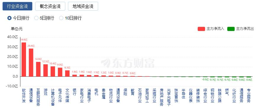 行业资金方面,截至收盘,软件开发、通信设备、互联网服务等净流入排名靠前,其中软件开发净流入34.64亿元。