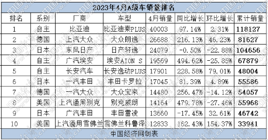 具体到车型方面,秦PLUS在4月份再度爆发,以超过4万辆的成绩折桂A级车市场,这也促使其成为细分市场前4个月的累计销冠。进入2023年以来,秦PLUS销量不断攀升,特别是秦PLUS DM-I 2023冠军版车型的推出,将门槛拉低至10万元以内,助力其迈向了“全品类轿车销冠”,更在轿车市场实现了从追赶者到领跑者的转变。此外,埃安S以同比增长494.62%至1.5万辆的成绩占据榜单第四位,这也是同比增幅最大的主流车型。