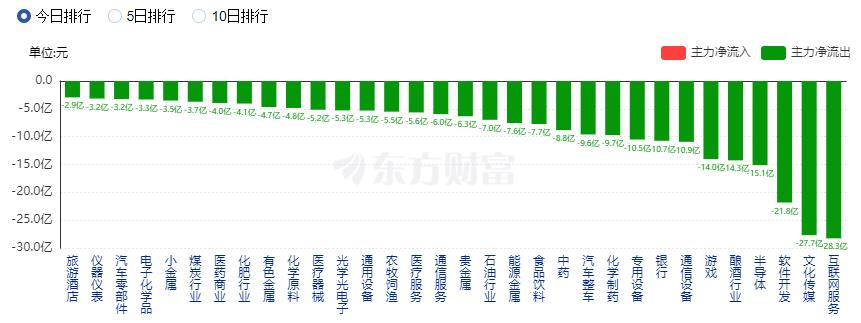 净流出方面,互联网服务、文化传媒、软件开发等净流出排名靠前,其中互联网服务净流出28.26亿元。