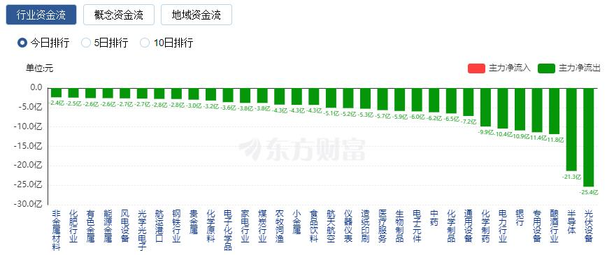 净流出方面,光伏设备、半导体、酿酒行业等净流出排名靠前,其中光伏设备净流出25.38亿元。