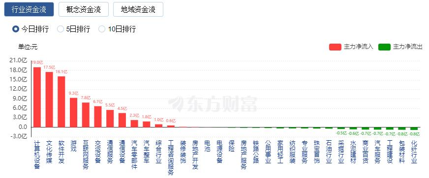 行业资金方面,截至收盘,计算机设备、文化传媒、软件开发等净流入排名靠前,其中计算机设备净流入18.96亿元。