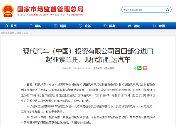 公告显示,根据《缺陷汽车产品召回管理条例》和《缺陷汽车产品召回管理条例实施办法》,现代汽车(中国)投资有限公司决定自2023年6月12日起,召回2011年4月1日至2013年5月31日生产的部分进口起亚索兰托2.4L汽油汽车33280辆;召回2011年6月16日至2012年8月7日生产的部分进口现代新胜达2.4L汽油汽车21447辆。