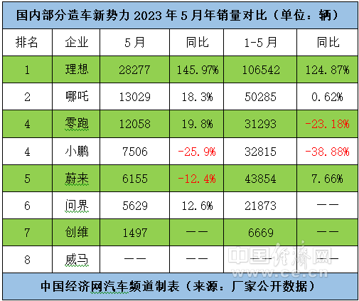 6月1日,几家国内造车新势力的销量数据如期而至。数据显示,5月,理想、哪吒、零跑、小鹏和蔚来的销量分别为28277辆、13029辆、12058辆、7506辆、6155辆,同比分别增长145.97%、18.3%、19.8%、-25.9%、-12.4%;前5个月的累计销量分别为106542辆、50285辆、31293辆、32815辆、43854辆,同比分别增长124.87%、0.62%、-23.18%、-38.88%、7.66%。