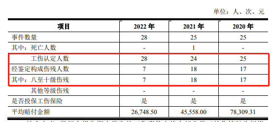 此外,永达股份作为属于劳动密集型制造型企业,日常生产安全不容忽视。而从招股书披露显示,公司在安全管理上存在疏忽,工商事故频发。招股书显示,2020年-2022年公司安全事件数量分别为25起、25起、28起。其中经鉴定构成伤残等级 8 级 4 次,9 级 10 次,10 级 28 次;报告期内的工伤人 员中涉及两名劳务外包员工,其他均为自有员工发生的工伤。