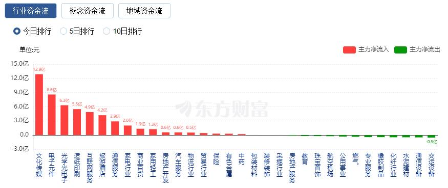行业资金方面,截至收盘,文化传媒、电子元件、光学光电子等净流入排名靠前,其中文化传媒净流入12.89亿元。