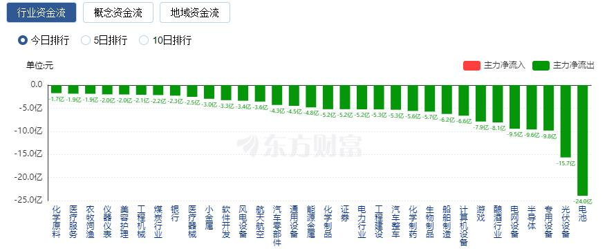 净流出方面,电池、光伏设备、专用设备等净流出排名靠前,其中电池净流出23.96亿元。