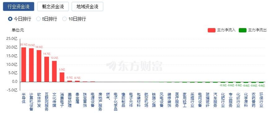 行业资金方面,截至收盘,半导体、计算机设备、软件行业等净流入排名靠前,其中半导体净流入20.07亿元。