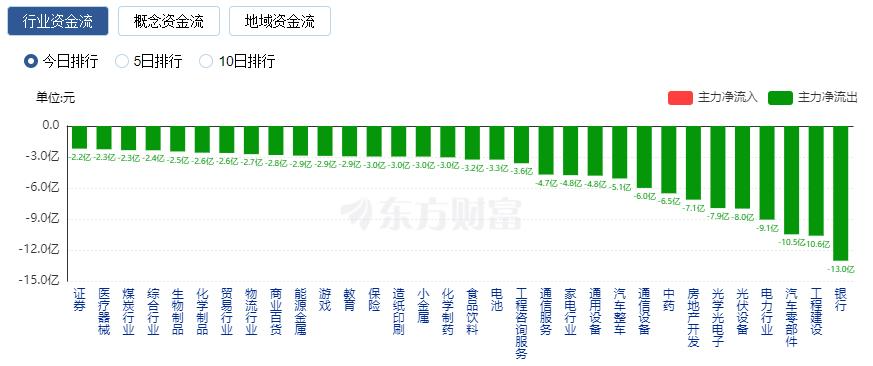 净流出方面,银行、工程建设、汽车零部件等净流出排名靠前,其中银行净流出13.04亿元。