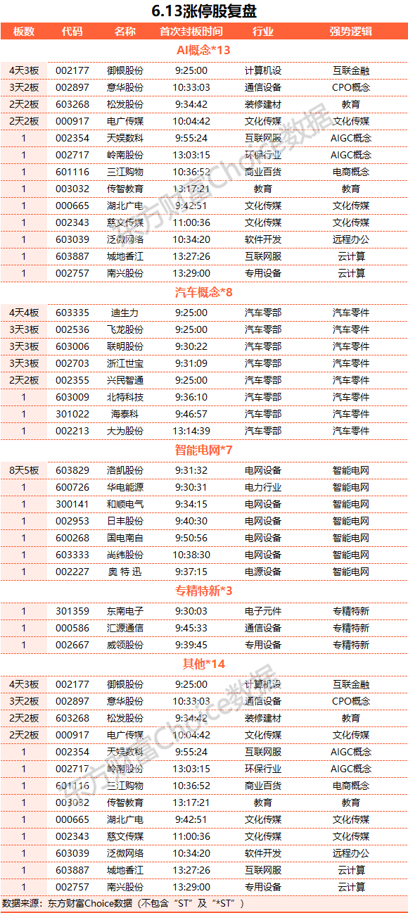 个股方面,上涨股票数量超过2600只。AI概念股反复活跃,其中算力概念股午后集体走强,亚康股份、大为股份、南兴股份、城地香江等涨停,浪潮信息一度涨停再创历史新高;ChatGPT及应用方向冲高,天娱数科、传智教育、岭南股份、慈文传媒等涨停,科大讯飞涨超9%再创历史新高。新能源车产业链个股继续活跃,迪生力、飞龙股份、联明股份等多股连板。特高压、电网概念股一度冲高,奥特迅、国电南自、航天晨光等涨停。下跌方面,医药股陷入调整,国药股份、千金药业跌约5%。