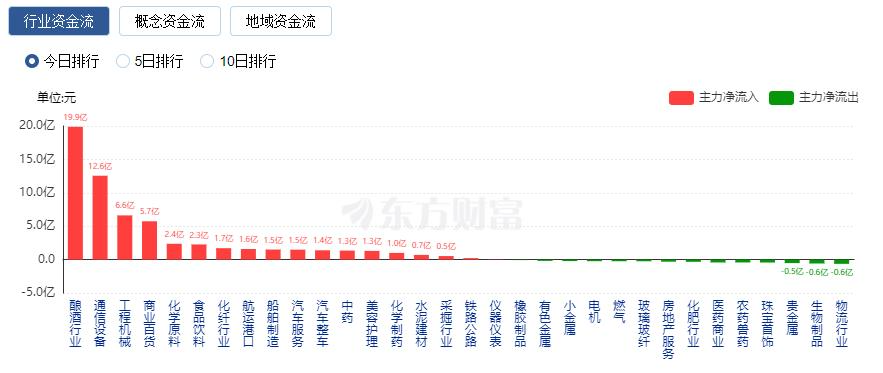 行业资金方面,截至收盘,酿酒行业、通信设备、工程机械等净流入排名靠前,其中酿酒行业净流入19.88亿元。