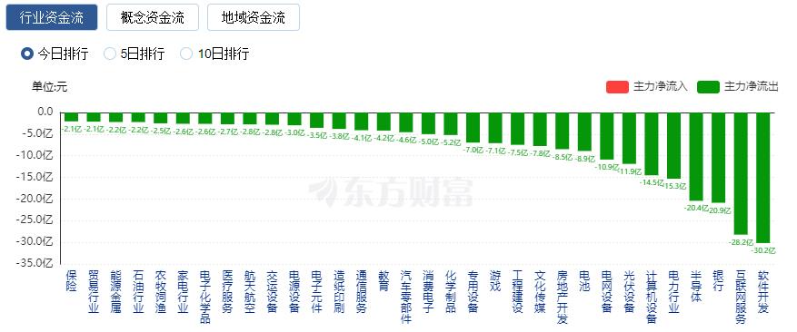 净流出方面,软件开发、互联网服务、银行等净流出排名靠前,其中软件开发净流出30.16亿元。