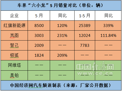 事实上,快速提升销量是“六小龙”当前都不得不思考的课题。数据显示,5月,红旗新能源、岚图、智己和极狐的销量分别为8500辆、3003辆、2009辆、1824辆,其中红旗新能源、岚图和极狐同比分别增长120%、231%、209%。