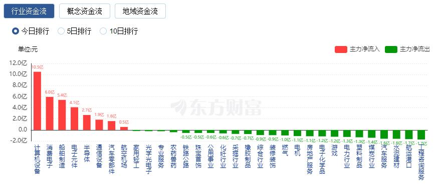 行业资金方面,截至收盘,计算机设备、消费电子、船舶制造等净流入排名靠前,其中计算机设备净流入10.51亿元。