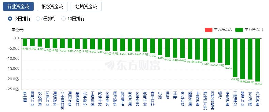 净流出方面,光伏设备、文化传媒、酿酒行业等净流出排名靠前,其中光伏设备净流出21.12亿元。