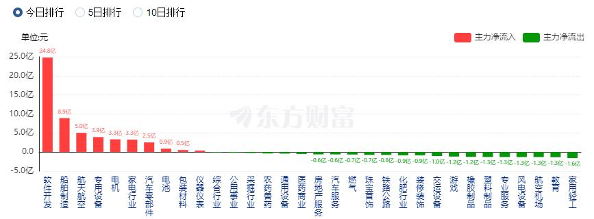 行业资金方面,截至收盘,软件开发、船舶制造、航天航空等净流入排名靠前,其中软件开发净流入24.80亿元。
