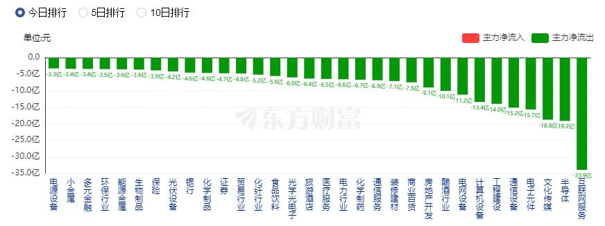 净流出方面,互联网服务、半导体、文化传媒等净流出排名靠前,其中互联网服务净流出33.94亿元。
