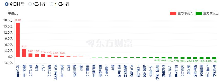 行业资金方面,截至收盘,光伏设备、酿酒行业、电力行业等净流入排名靠前,其中光伏设备净流入16.99亿元。
