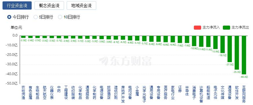 净流出方面,互联网服务、软件开发、通信设备等净流出排名靠前,其中互联网服务净流出40.25亿元。