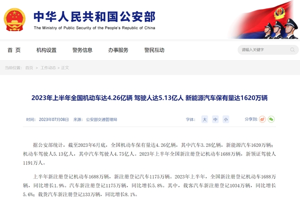 中国经济网7月10日讯(记者 郭跃)7月8日,公安部发布数据:截至2023年6月底,全国机动车保有量达4.26亿辆,其中汽车3.28亿辆,新能源汽车1620万辆;机动车驾驶人5.13亿人,其中汽车驾驶人4.75亿人,已有95万人取得C6准驾车型驾驶证。