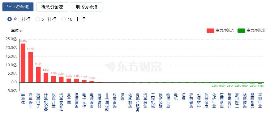 行业资金方面,截至收盘,半导体、汽车整车、消费电子等净流入排名靠前,其中半导体净流入22.55亿元。