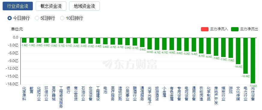 净流出方面,光伏设备、电力行业、文化传媒等净流出排名靠前,其中光伏设备净流出17.60亿元。