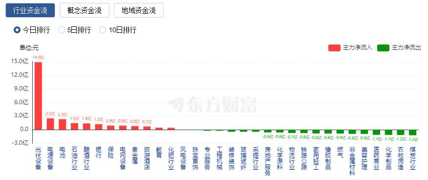 行业资金方面,截至收盘,光伏设备、电源设备、电池等净流入排名靠前,其中光伏设备净流入14.87亿元。