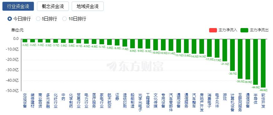 净流出方面,软件开发、半导体、通信设备等净流出排名靠前,其中软件开发净流出46.65亿元。