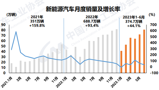 相比车市整体,新能源汽车保持快速增长趋势。数据显示,6月新能源汽车产销分别完成78.4万辆和80.6万辆,同比分别增长32.8%和35.2%,市场占有率达到30.7%,其中插电式混合动力汽车产销量首创历史新高;上半年,产销分别完成378.8万辆和 374.7万辆,同比分别增长42.4%和44.1%,市场占有率达到28.3%。