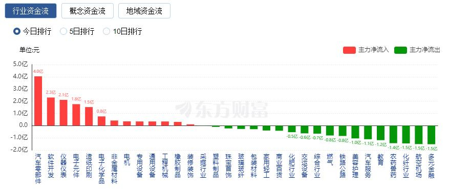 行业资金方面,截至收盘,汽车零部件、软件开发、仪器仪表等净流入排名靠前,其中汽车零部件净流入4.03亿元。