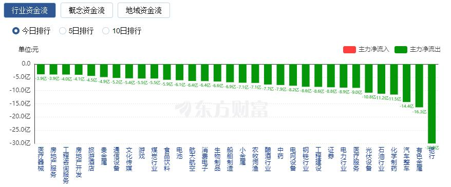 净流出方面,银行、有色金属、汽车整车等净流出排名靠前,其中银行净流出29.98亿元。