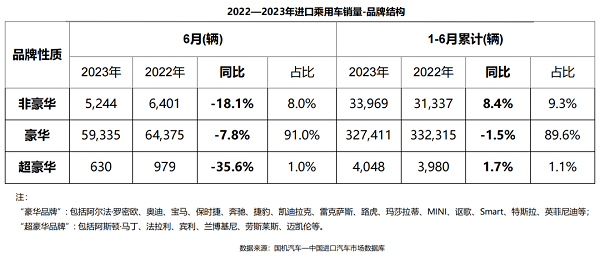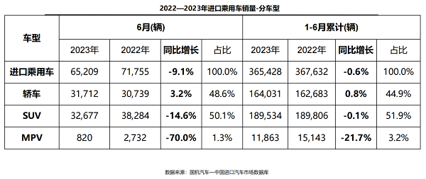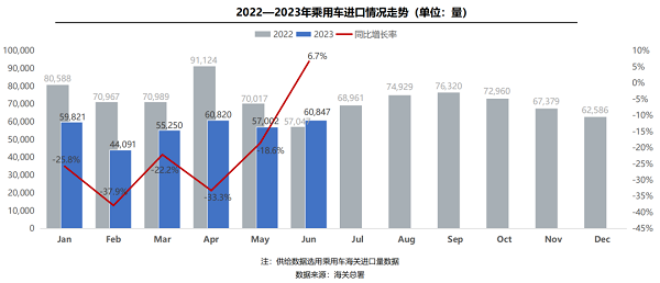 销量方面,6月,进口乘用车终端销售6.5万辆,结束了连续四个月的增长态势。同比下滑9.1%,环比增长6.6%。1-6月,进口乘用车累计销售36.5万辆,同比微降0.6%。