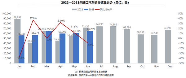 综合中国汽车流通协会进口车工作委员会及国机汽车发布的信息,今年6月我国进口汽车6.3万辆,同比上升8.6%。1-6月,累计进口汽车34.6万辆,同比下滑22.4%;累计进口金额1500.7亿元,同比下滑17.5%。